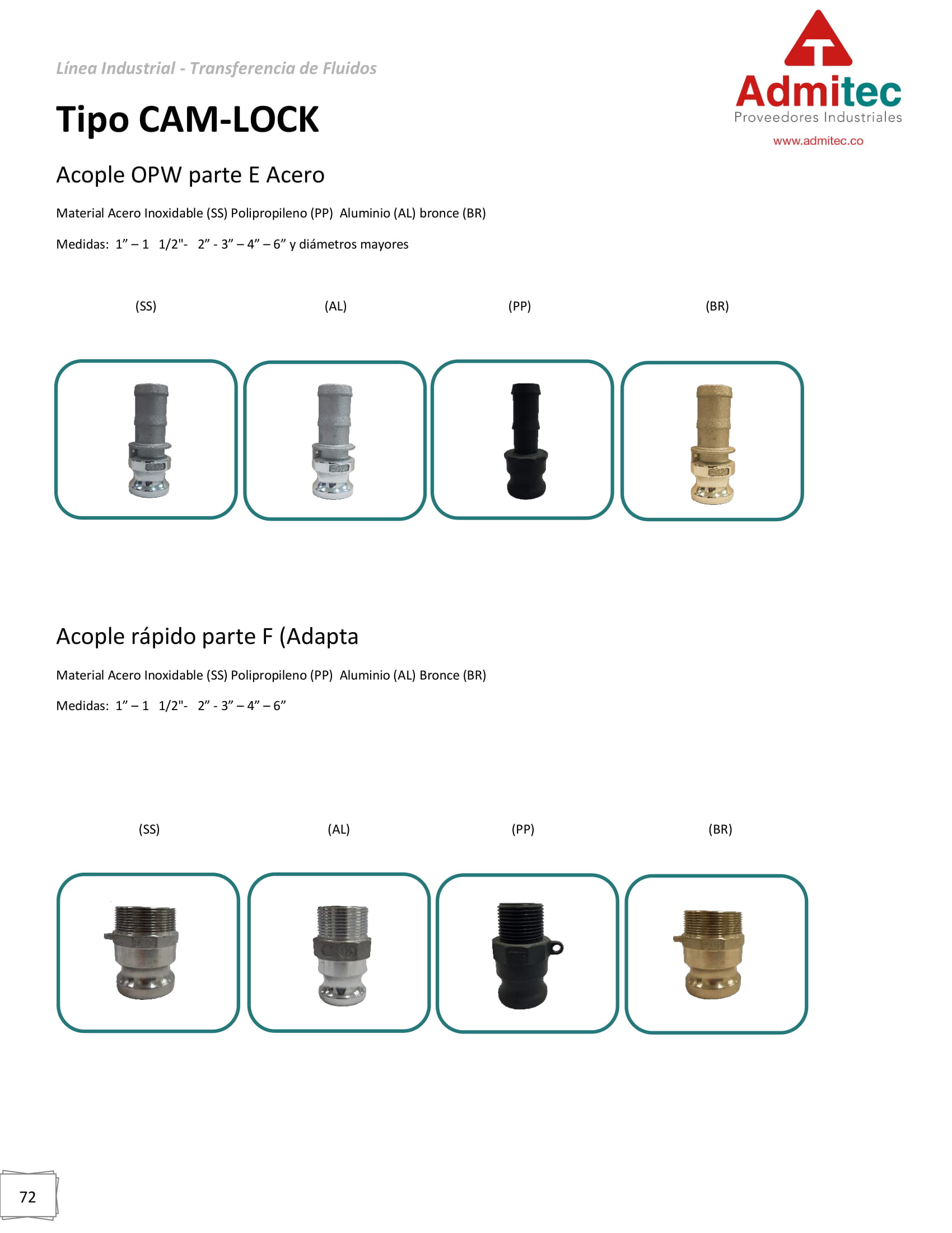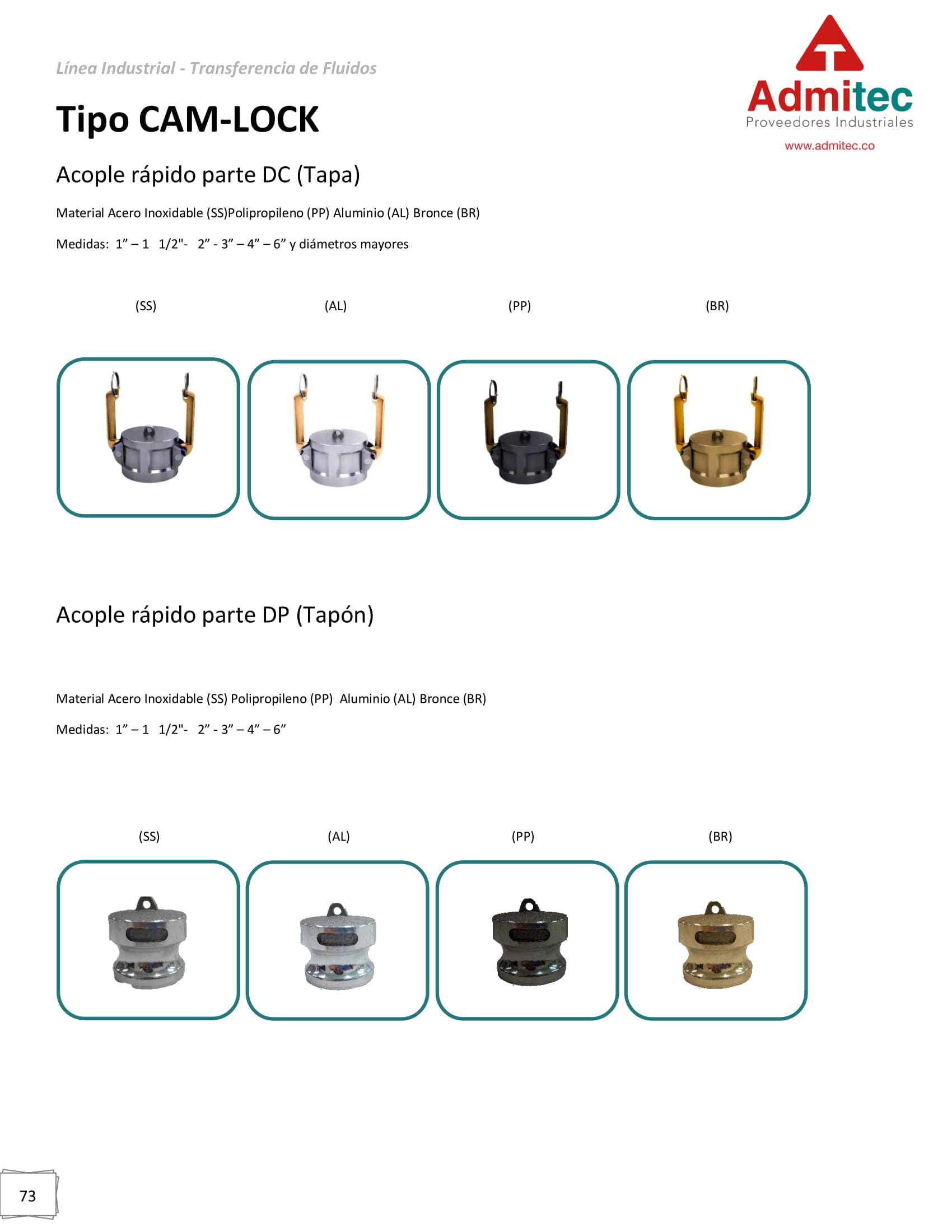 Acoples Industriales (Cam Lock) Medidas: 1” – 1 1/2″- 2” – 3” – 4” – 6” y diámetros mayores