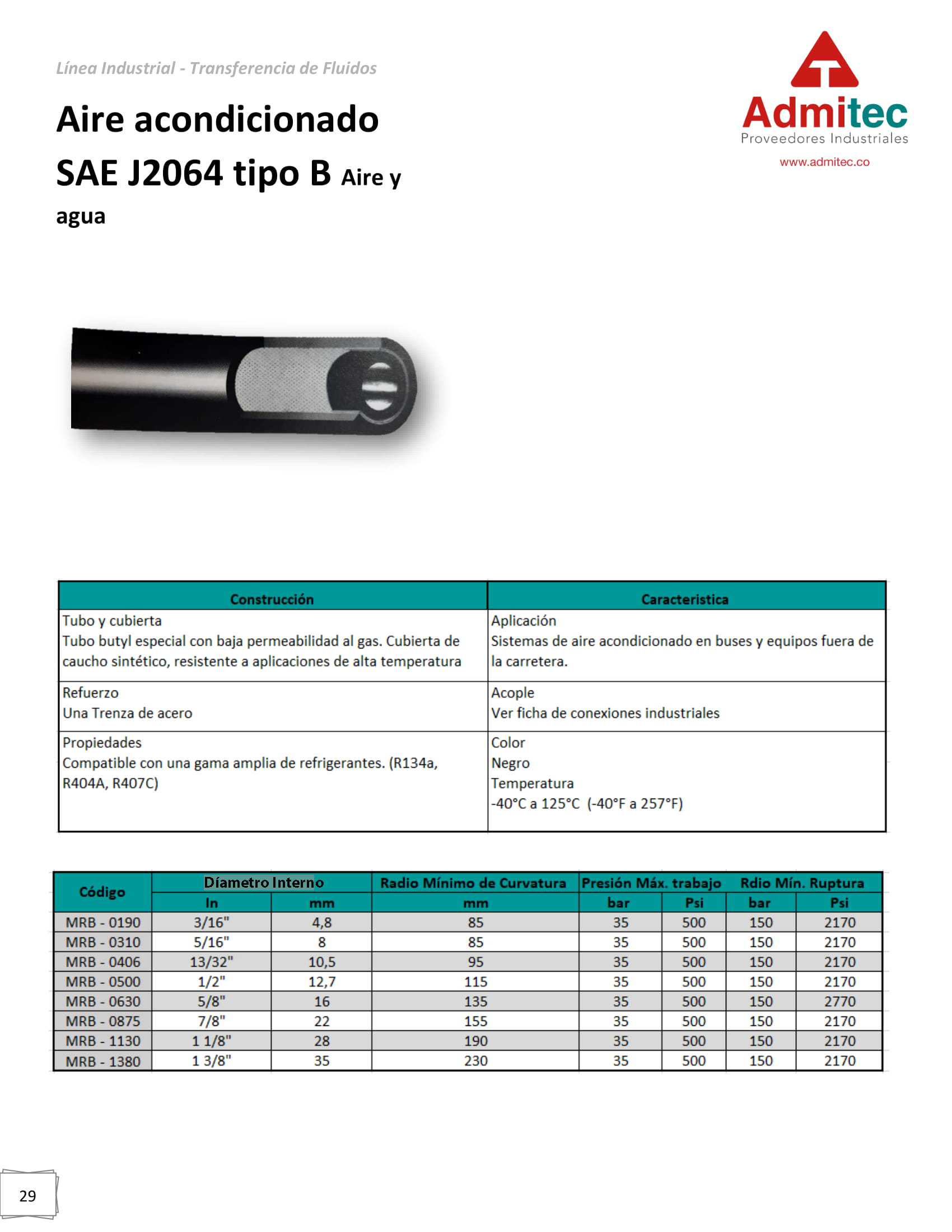 SAE J2064 tipo B, Sistemas de aire acondicionado en buses y equipo fuera de carretera SKU: LII-029 Categories: Mangueras AIRE / AGUA, Soluciones Industriales Description Description Ver más en ficha técnica: