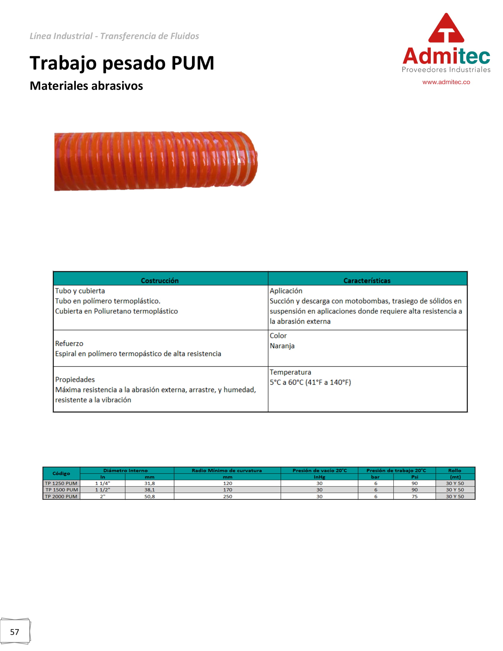 Succión y descarga con motobombas, trasiego de sólidos, en suspensión en aplicaciones donde se requiera alta resistencia a la abrasión externa SKU: LII-057 Categories: Mangueras MATERIALES ABRASIVOS, Soluciones Industriales Description Description Ver más en ficha técnica:
