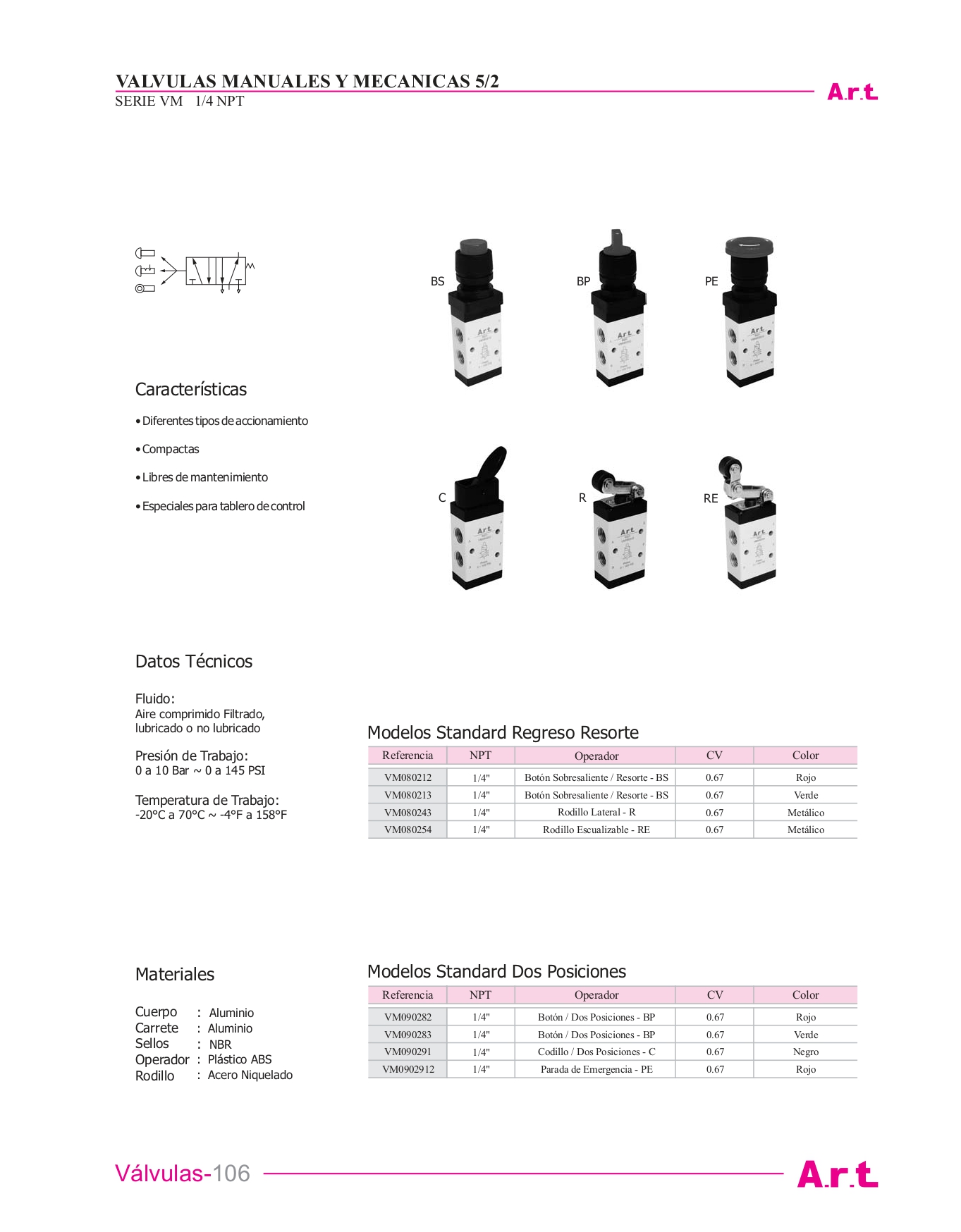 Serie VM Válvulas en diámetros de (1/4″) NPT Diferentes tipos de accionamientos, compactas SKU: ART-032 Categories: ART Válvulas, Válvulas Manuales y Mecánicas 5/2 Description Additional information Description Ver más en ficha técnica: Additional information Serie Serie VM Normas Válvulas Manuales y Mecánicas 5/2 VM ART Materiales Acero Niquelado, Plastico ABS