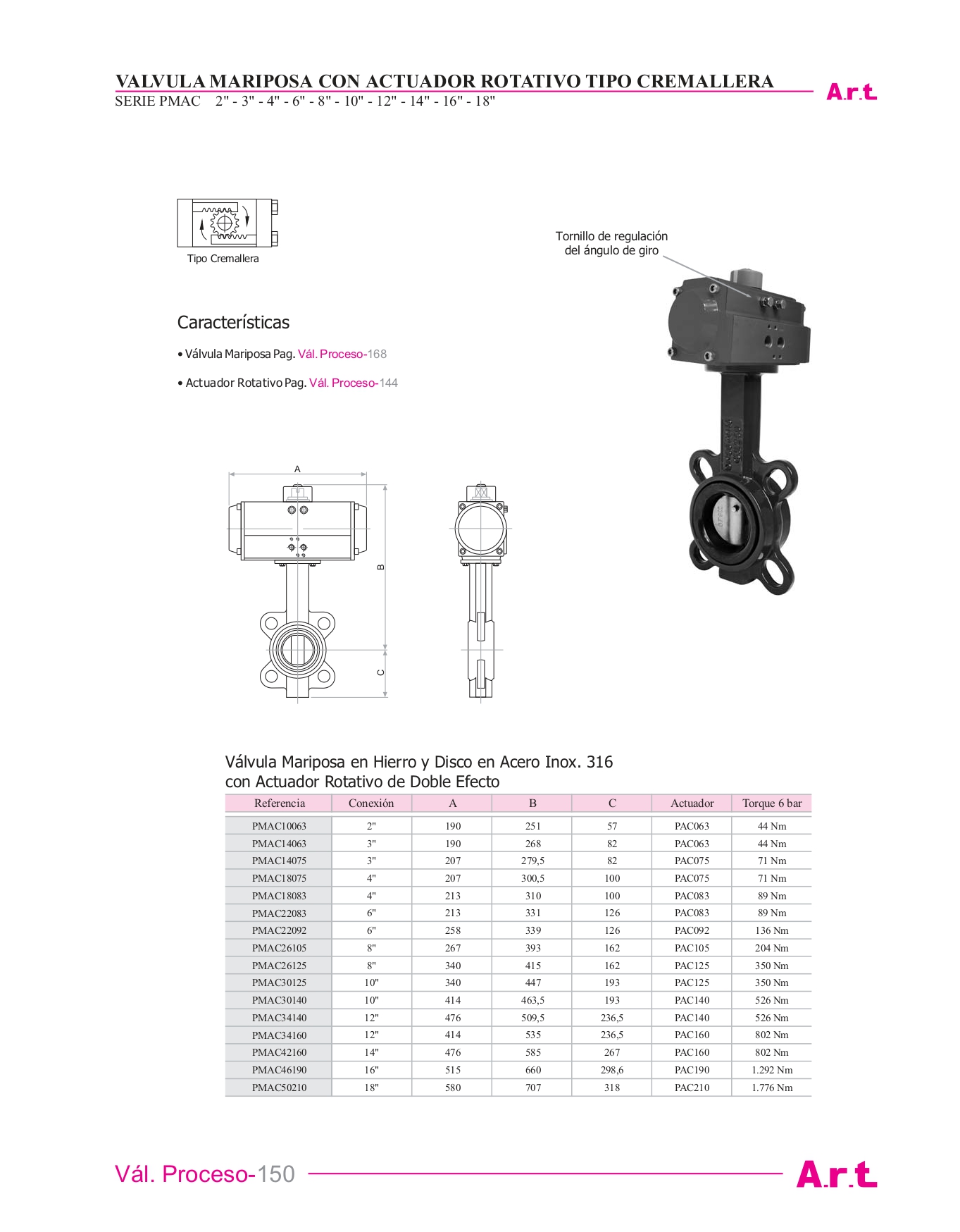 Serie PMAC, en diámetros de (2″, 3″, 4″, 6″, 8″, 10″, 12″, 14″, 16″, 18″) Tornillo de regulación del ángulo de giro SKU: ART-047 Categories: ART Válvulas de Proceso, Línea Neumática, Válvulas Mariposa Con Actuador Rotativo Description Additional information Description Ver más en ficha técnica Additional information Serie Serie PMAC Normas Norma ISO 5213, ANSI 150, DIN PN 10/16,DIN 3202K K 1 Materiales Fundición GG-20, Acero Inoxidable